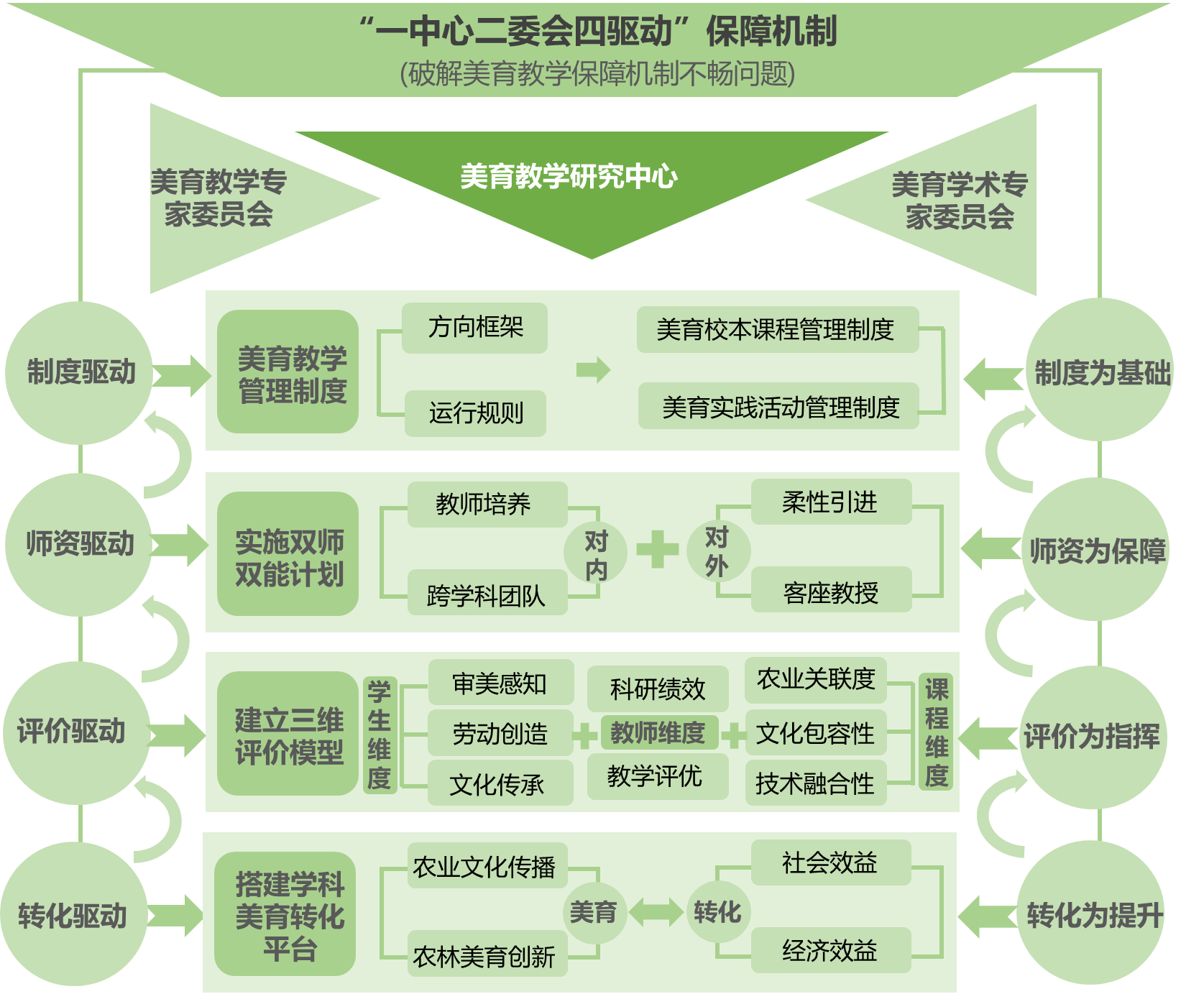 成立美育教学研究中心,分管校长挂帅、部门协同推进,制定美育五年行动纲要,实施美育浸润。分别设立美育教学和学术专家委员会,由分管校长、美育专家担任主任,提升教学科研质量。实行制度-师资-评价-转化四驱联动机制,确立方向框架与运行规则,制定教学管理制度;推动双师双能计划,跨学科培养农美师资,聘民间艺术家为客座教授等;以学生-教师-课程评价模型,考核审美文化力、美育科研绩效等;搭建转化平台,提升社会和经济效益。