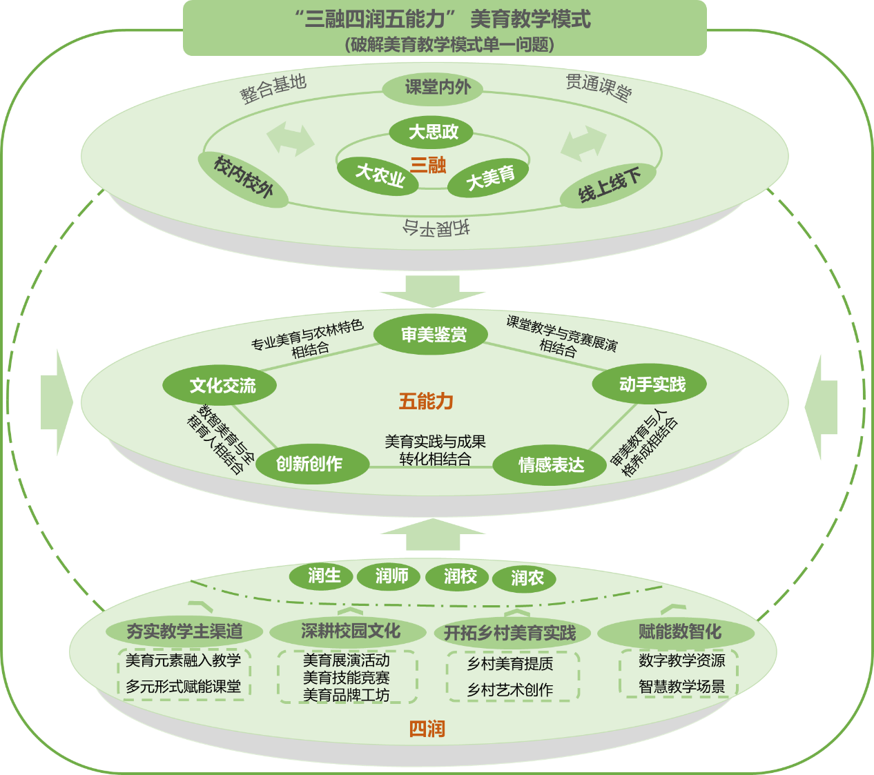 ②协同课堂教学、校园文化、乡村实践、网络云课堂实现以美润生、润师、润校、润农。聚焦教学主体,以混合式、讲授式、体验式、实践式、虚拟式等传播美。深耕校园文化,高雅艺术进校园,推动中法文化艺术节、中·塞艺术交流;金秋艺术节设艺术展览、音乐展演、学术交流,追求向真向善向美;主抓全国学科竞赛、双创大赛以赛促学;推出原创话剧和歌曲《种子》《我们的大调研》等,组建岱下青年合唱团和手绘、茶艺、葡萄酒工作坊等。开拓乡村实践,未进校门先入乡村,高考录取就参加大调研,四年不断线;创作公益乡村墙绘,改造美丽乡村,设计智慧农业园区等;对口帮扶泰安市岱岳区中小学美育浸润。赋能数智化,开发“耕云学堂”智慧教育平台,创设师生课堂与实践基地联通等教学场景;利用乡村振兴课程数据库等;创作《苹果从哪儿来》等微电影,融入耕读文化节,拓展云端美育。