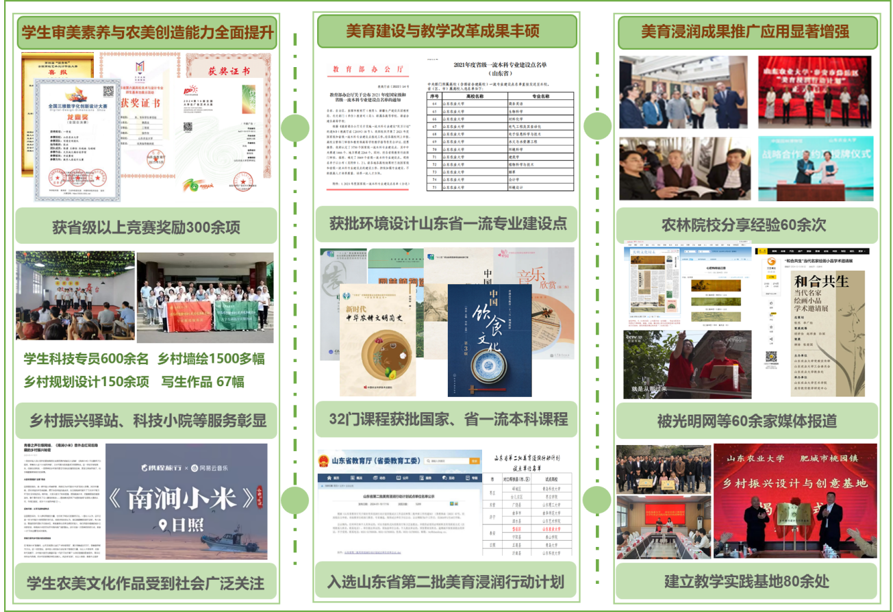 学生在教育部高校学科竞赛、山东省教育厅技能展示等美育竞赛中获省级以上奖励300余项,其中国家级一等奖8项、二等奖10项、三等奖10项,省级特等奖2项、一等奖40项。发表论文120余篇,主持国家级大学生创新创业训练项目15项,省级10项。在乡村振兴驿站、科技小院建设中有600余名学生站长和科技专员,主持参与乡村规划等项目150余项,创作了曾获山东省新文科实践创新大赛金奖的乡村墙绘1500多幅,以乡村振兴基地肥城市黑牛山村为取景地的素描写生作品67幅,撰写乡村振兴案例,开展文艺轻骑兵、红色文化与党的创新理论宣讲等,原创歌曲《南涧小米》点击量达10万多次。学生思想政治素质、学科理论、美育创新能力得到增强,高质量新农人受到社会肯定与欢迎。