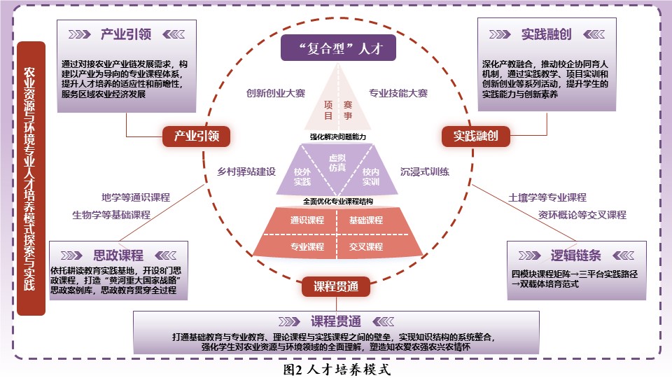 农业资源与环境专业始终立足于农业绿色发展及乡村振兴等国家战略,致力于培养兼具农业资源高效利用能力、生态文明素养和全球视野的“复合型”人才。专业于2010年获批国家级特色专业,2019年获国家级一流本科专业建设点,教学基础雄厚。传统培养模式已难以满足现代产业对人才的迫切需求。自2016年承担“基于校企联合基地的卓越农林人才培养模式”项目以来,团队先后主持国家级等教研项目7项,通过系统探索与实践,构建产业引领、课程贯通、实践融创的农业资源与环境专业人才培养模式,显著提升人才素质与行业适应性,为服务国家战略提供了有力支撑(图1)。