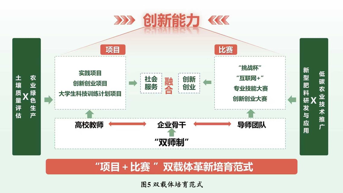 “项目+赛事”双载体,提升创新能力。聚焦土壤质量评估、农业绿色生产等问题,组织学生参加全国专业技能大赛。围绕新型肥料研发与应用等产业需求,参加“互联网+”、大学生创新创业大赛。设立创新创业专项经费,组建由学校教师与企业技术骨干组成的“赛事导师团”,对大赛提供支持与指导(图5)。