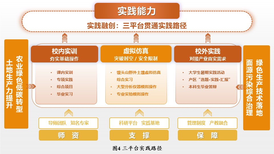 “校内实训+虚拟仿真+校外实践”三平台联动,提高实践能力。依托实验教学中心,开设综合性实验项目,形成“课内实训-专项实践-综合项目-毕业实习”递进式实践链条;开展“乡村驿站建设”活动,把产业痛点转化为毕业题目,组织7场产区“选题-实践-汇报”毕业答辩;开发“馒头山野外土壤虚拟仿真综合实习”等虚拟仿真项目,实现复杂场景可重复、沉浸式训练,降低安全风险和实验成本(图4)。
