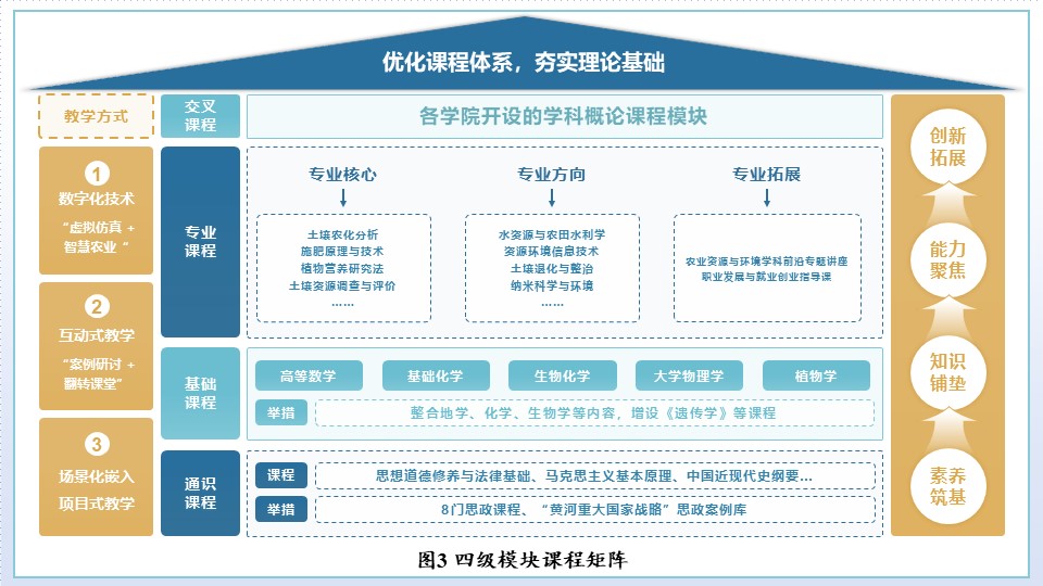 “通识+基础+专业+交叉”四模块以“素养筑基→知识铺垫→能力聚焦→创新拓展”为逻辑链条,实现层层递进的培养效果。通识课程依托耕读教育实践基地,开设8门思政课程,打造“黄河重大国家战略”思政案例库;基础课程整合地学、生物学等内容,增设《遗传学》等课程;专业课程重构《土壤学》等课程,嵌入智慧农业等前沿技术,建有4门国家/省级一流课程和1门智慧图谱课程;交叉课程由各学院开设的学科概论组成,强化跨学科思维。优化课程体系,融合数字化技术,采用项目化、案例化教学,提高学生专业基础(图3)。